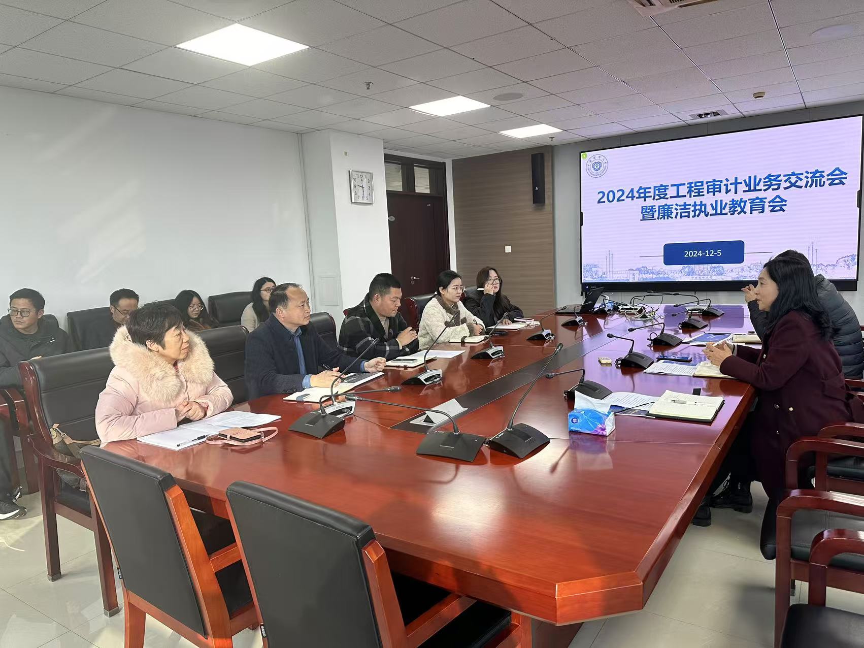 2024年12月5日上午,审计处召开2024年度工程审计工作交流暨廉洁执业教育会议,进一步加强跟踪审计单位管理,防范审计风险,规范审计行为,推动工程审计工作高质高效。审计处处长孙立冰、工程审计相关老师、四家跟踪审计单位的项目负责人及具体审计人员参会。